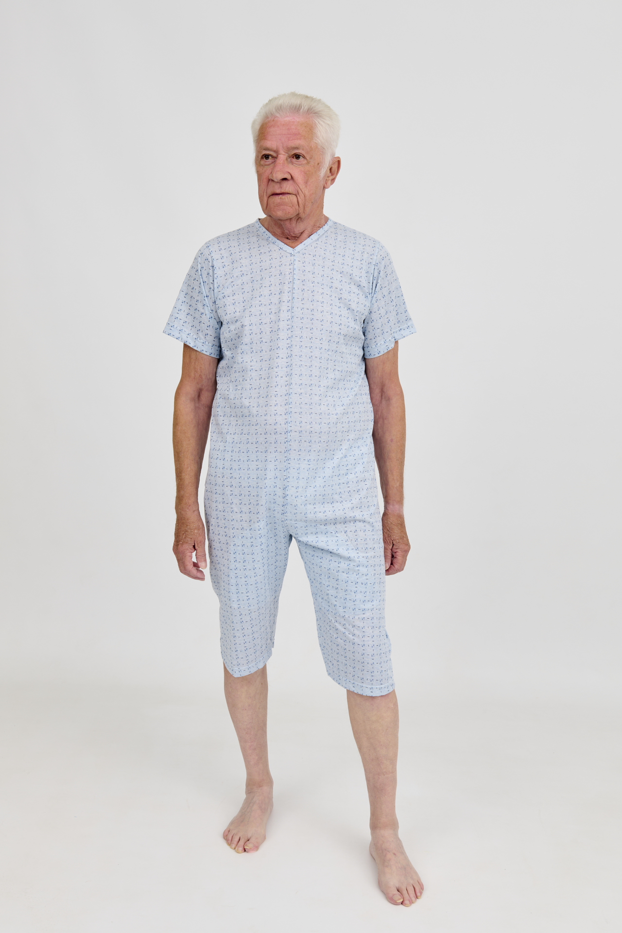 Pyjama met korte pijpen, korte mouwen, ritssluiting op de rug en rits tussen de benen, V-hals, zitgedeelte extra verstevigd, maat XS tot XXL.